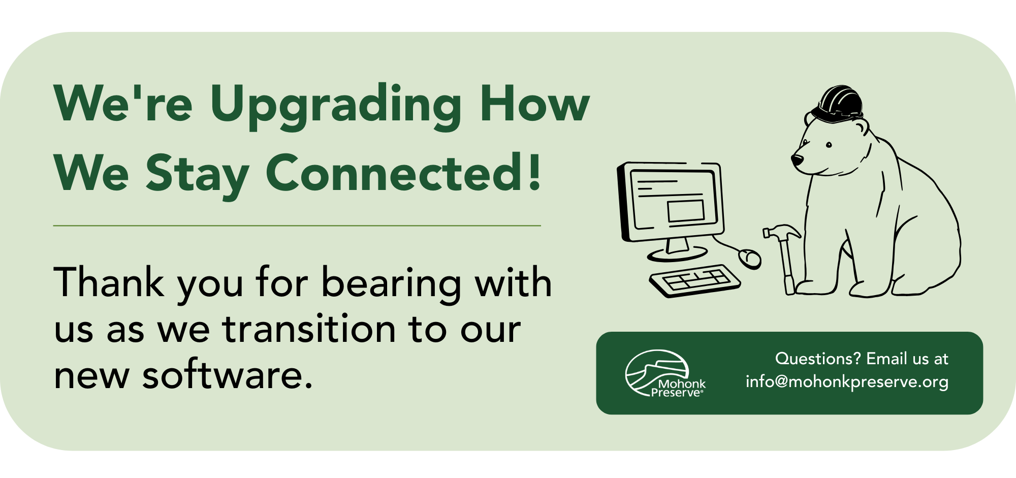 We’re excited to share that Mohonk Preserve is launching a new digital system to better serve our members, donors and visitors. This upgraded platform will make it easier than ever to stay connected with the Preserve and engage with the programs, events and conservation efforts you care about most.