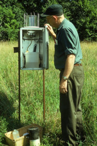 Photo: Trust Founder and Co-Administrator Dan Smiley taking samples at the acid rain collector. Photo from the Mohonk Preserve Daniel Smiley Research Center archives
