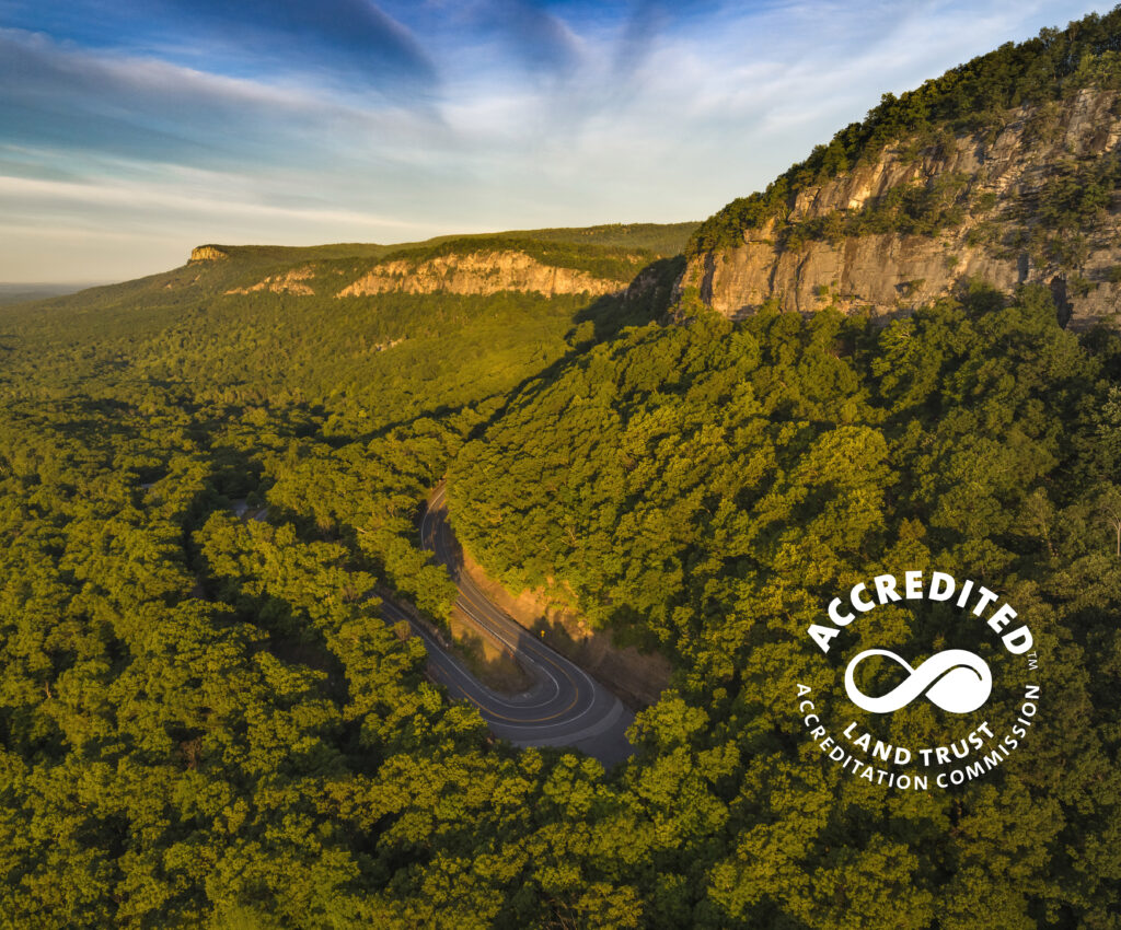 Photo: Shawangunk Ridge with the Land Trust Accreditation Commission seal. Photo by Gerald Berliner.