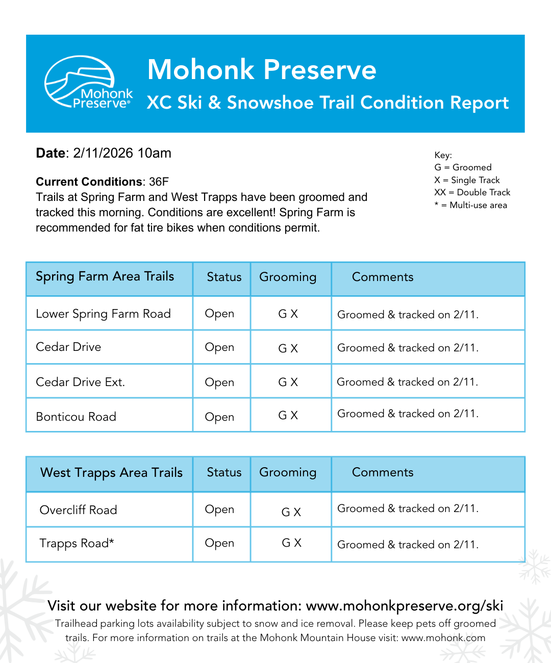 When conditions, staff obligations and partner support permit, groomed trails may be available at the West Trapps and Spring Farm Trailheads. Please note that, in inclement weather, parking lots will remain closed until snowplow operators deem them safe for access.